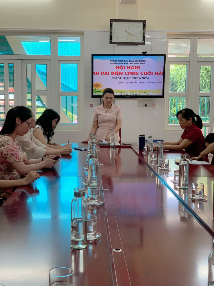 16h chiều ngày 22/05/2024, tại Văn phòng trường Mầm non Sao Sáng 4 đã diễn ra cuộc họp Ban đại diện phụ huynh học sinh nhà trường cuối năm học 2023-2024. Với sự tham gia đông đủ của Ban giám Hiệu nhà trường, Ban đại diện Cha mẹ học sinh nhà trường và các lớp. Đồng chí Hiệu trưởng đã báo cáo kết quả thực hiện nhiệm vụ năm học 2023-2024 và triển khai Phương hướng hoạt động của nhà trường trong thời gian tới. Đại diện Ban ĐDCMHS nhà trường đã báo cáo kết quả hoạt động của Ban ĐDCMHS nhà trường trong năm học qua. Phụ huynh học sinh đều đồng thuận nhất trí với các nội dung báo cáo, triển khai trong cuộc họp và tiếp tục đồng hành với nhà trường trong thời gian tới. Cuộc họp diễn ra với bầu không khí cởi mở, thân thiện.