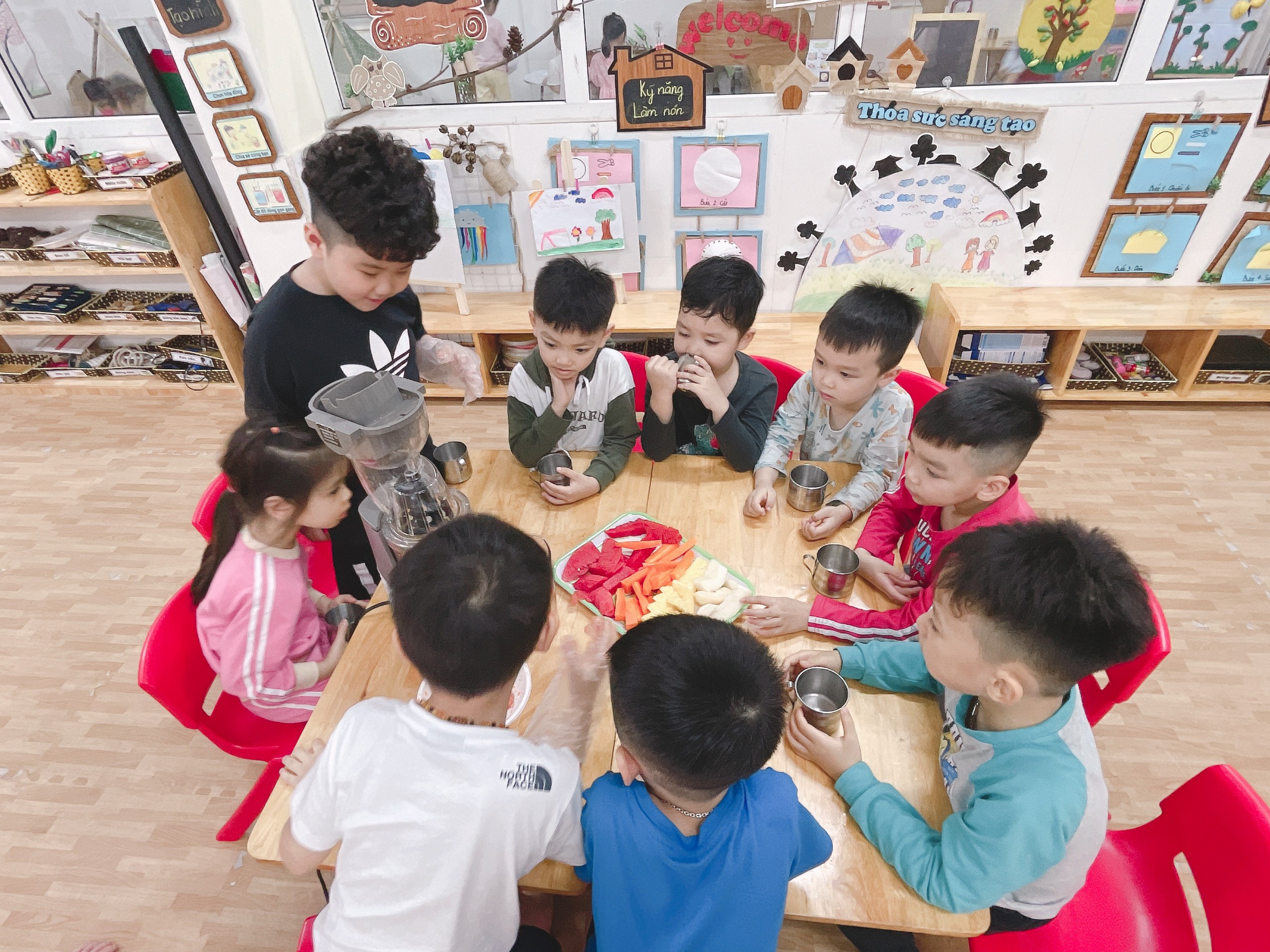 Trái cây vốn là một loại thực phẩm cung cấp nhiều chất dinh dưỡng thiết yếu cho cơ thể. Vậy làm thế nào để làm được một côc nước trái cây ngon và đảm bảo chất dinh dưỡng? Hãy cùng các bé trường Mẫu giáo Sao Sáng 4 đến với hoạt động "Điều kì diệu từ nươc ép quả" nhé!