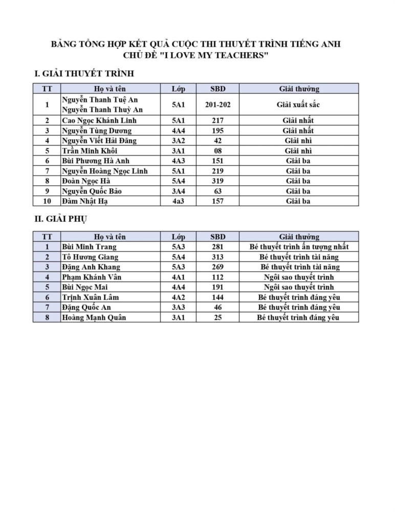 Cuộc thi đã kết thúc thành công tốt đẹp, để lại ấn tượng sâu sắc trong lòng các cô giáo cũng như học sinh tham gia. Đây là cơ hội để các em bày tỏ tình cảm của mình và cũng là dịp để rèn luyện kỹ năng giao tiếp và thuyết trình bằng tiếng Anh, góp phần phát triển khả năng ngôn ngữ và tư duy phản biện của các em.