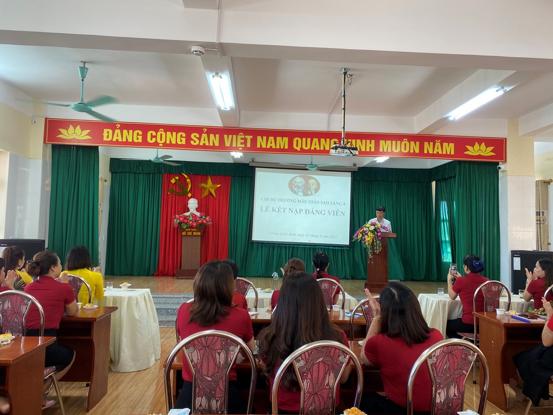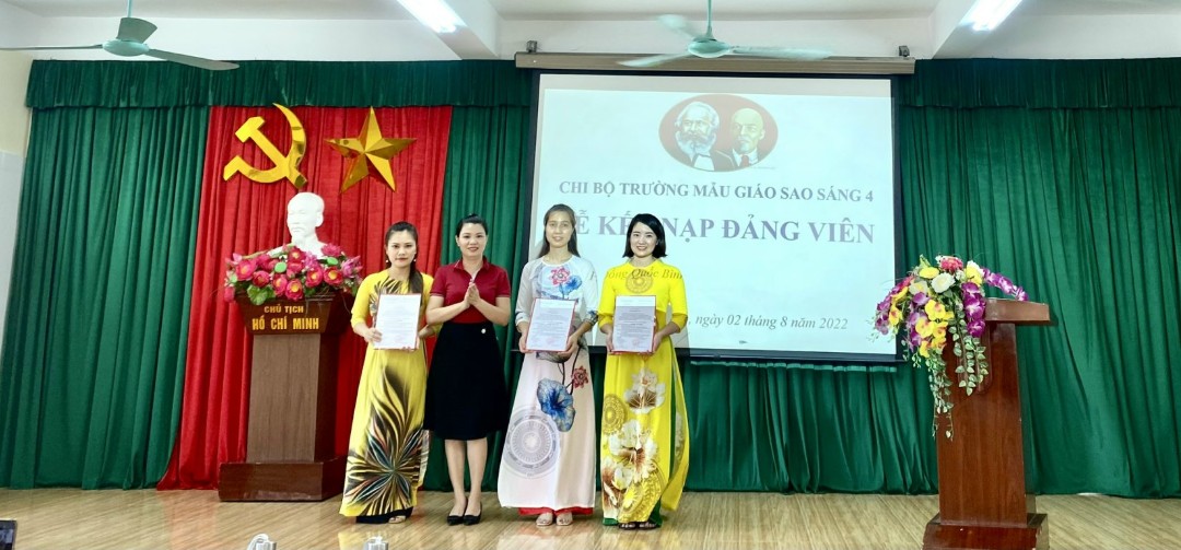 Thực hiện Nghị quyết Đại hội Chi bộ trường Mẫu giáo Sao Sáng 4 về phát triển Đảng viên. Ngày 02/8/2022, Chi bộ trường Mẫu giáo Sao Sáng 4 đã long trọng tổ chức lễ kết nạp Đảng viên mới đối với 3 quần chúng ưu tú: Vũ Thị Quyên, Nguyễn Thị Đường, Nguyễn Ngọc Anh. Đây là sự kiện có ý nghĩa quan trọng trong công tác xây dựng Đảng góp phần phát triển, nâng cao chất lượng Đảng viên.