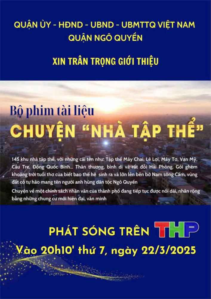 Thực hiện Thông báo số 886-TB/QU ngày 22/9/2024 của Quận uỷ Ngô Quyền về Kết luận của Thường trực Quận uỷ về việc xây dựng phóng sự (hoặc phim tài liệu) về công tác lãnh đạo, chỉ đạo, triển khai thực hiện các chủ trương của thành phố liên quan đến chung cư cũ trên địa bàn quận.UBND quận đã phối hợp với Đài Phát thanh và Truyền hình Hải Phòng (nay là Trung tâm Báo chí và Truyền thông Hải Phòng) xây dựng và hoàn thiện Phim tài liệu “Chuyện nhà tập thể” về các chung cư cũ trên địa bàn quận. “Chuyện nhà tập thể” - Chuyện về một chính sách nhân văn của thành phố đang tiếp tục được nối dài, nhân rộng bằng những chung cư mới hiện đại, văn minh.